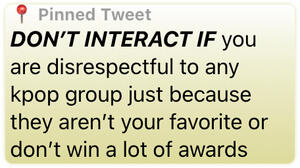 DONโT INTERACT IF you are disrespectful to any kpop group just because they arenโt your favorite or donโt win a lot of awards